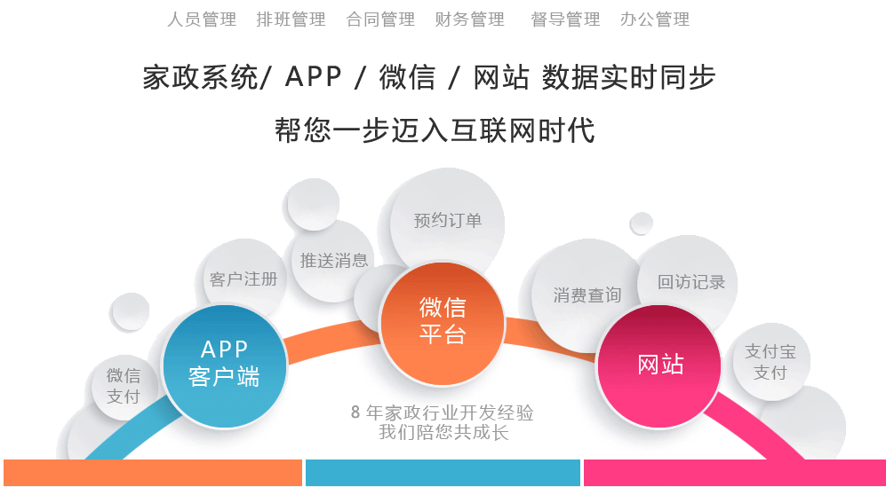 O2O時(shí)代,輕松建立屬于您自己的服務(wù)平臺(tái)!網(wǎng)站下單,預(yù)約選人,微信對(duì)接,淘寶對(duì)接,APP客戶(hù)端,網(wǎng)絡(luò)支付,直接對(duì)接家政系統(tǒng),派單結(jié)單,OK完成!各項(xiàng)收支統(tǒng)計(jì)報(bào)表,實(shí)時(shí)反映您的經(jīng)營(yíng)情況。不需要投入太多金錢(qián),不需要在前期設(shè)計(jì)上投入太多精力,輕輕松松建立屬于您自己的大平臺(tái)。