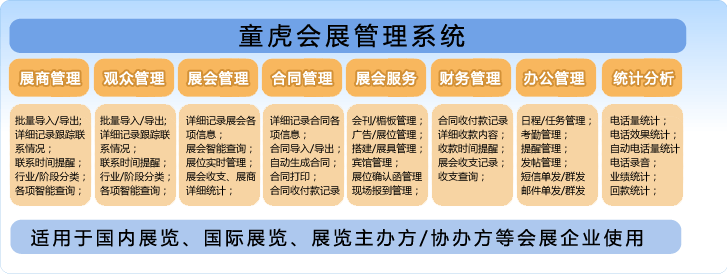 童虎會展管理系統(tǒng)(展會公司管理系統(tǒng))是針對各類會展公司(國內(nèi)展覽、國際展覽、展覽主辦方、協(xié)辦方等)開發(fā)的應(yīng)用軟件,作為會展信息化平臺的產(chǎn)品,集成了展商管理、展會管理、展會服務(wù)管理(會刊/楣板/廣告/展位/搭建/展具/賓館等各方面管理)、合同管理、財務(wù)管理、辦公管理等展覽公司用到的全方位管理功能,從客戶的尋找、跟蹤、溝通到后期的簽單、回款及日常辦公管理。