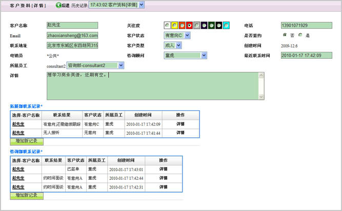 打開某一客戶資料,詳細資料和溝通的記錄在同一頁面上,員工在與客戶溝通中,可以隨時記錄并查看前期溝通記錄,保證溝通過程的準確性,有效地避免了前后矛盾,出現(xiàn)漏洞的情況發(fā)生,溝通完畢,立刻填寫溝通結(jié)果和修改客戶狀態(tài),有效地保證了工作效率。