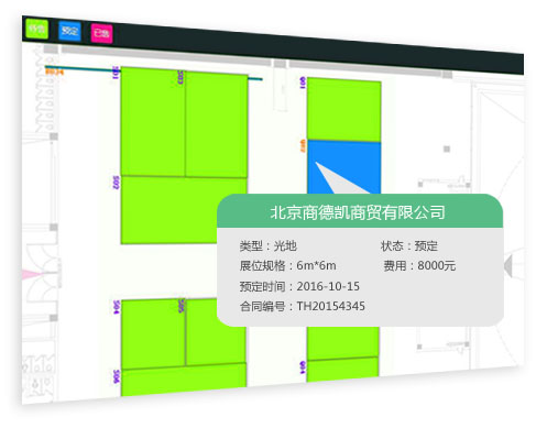動(dòng)態(tài)展位圖實(shí)時(shí)反映展位銷售情況 銷售:實(shí)時(shí)關(guān)注展位預(yù)定情況,心中有數(shù) 展商:通過網(wǎng)站或手機(jī)端查看、預(yù)定展位