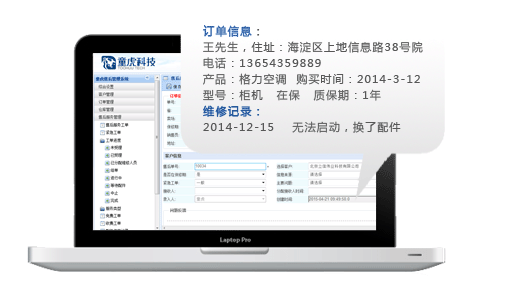 來電彈出客戶個人信息,購買產(chǎn)品型號,購買時間,是否在保,歷次維修記錄等,方便客服人員直接跟客戶交流,并可直接填寫客戶要求的維護(hù)內(nèi)容 |
