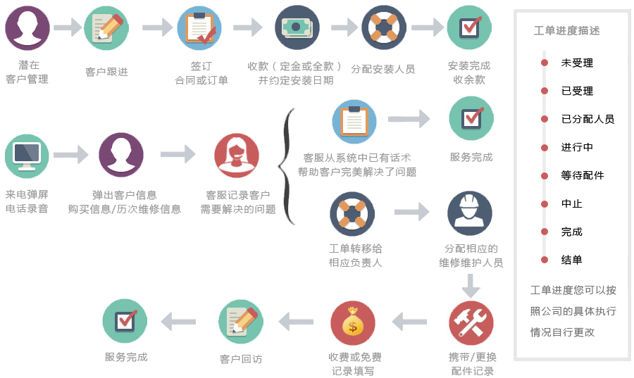 潛在客戶管理、銷售管理、訂單管理、財務(wù)管理、售后服務(wù)管理、派單管理、派單進(jìn)度管理、派單提醒、配件領(lǐng)用管理、回訪管理、投訴管理、商品管理、倉庫管理、辦公管理等 完整CRM管理功能+完善售后管理流程設(shè)計 完美服務(wù)做到極致 |