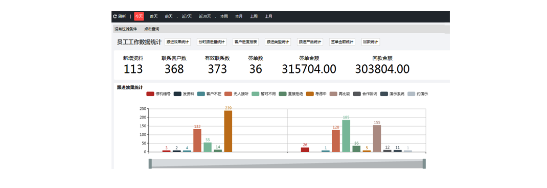 10、圖形展現(xiàn)功能,讓銷售人員及經(jīng)理隨時查看工作狀態(tài)及工作進度。有利于形成員工的內(nèi)部競爭;